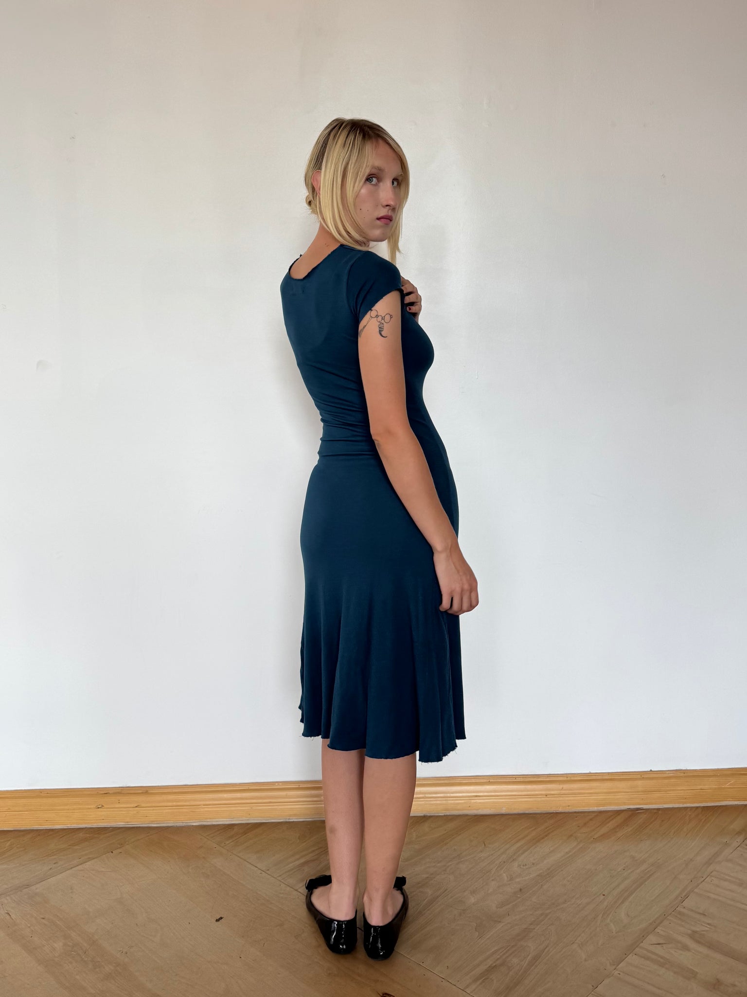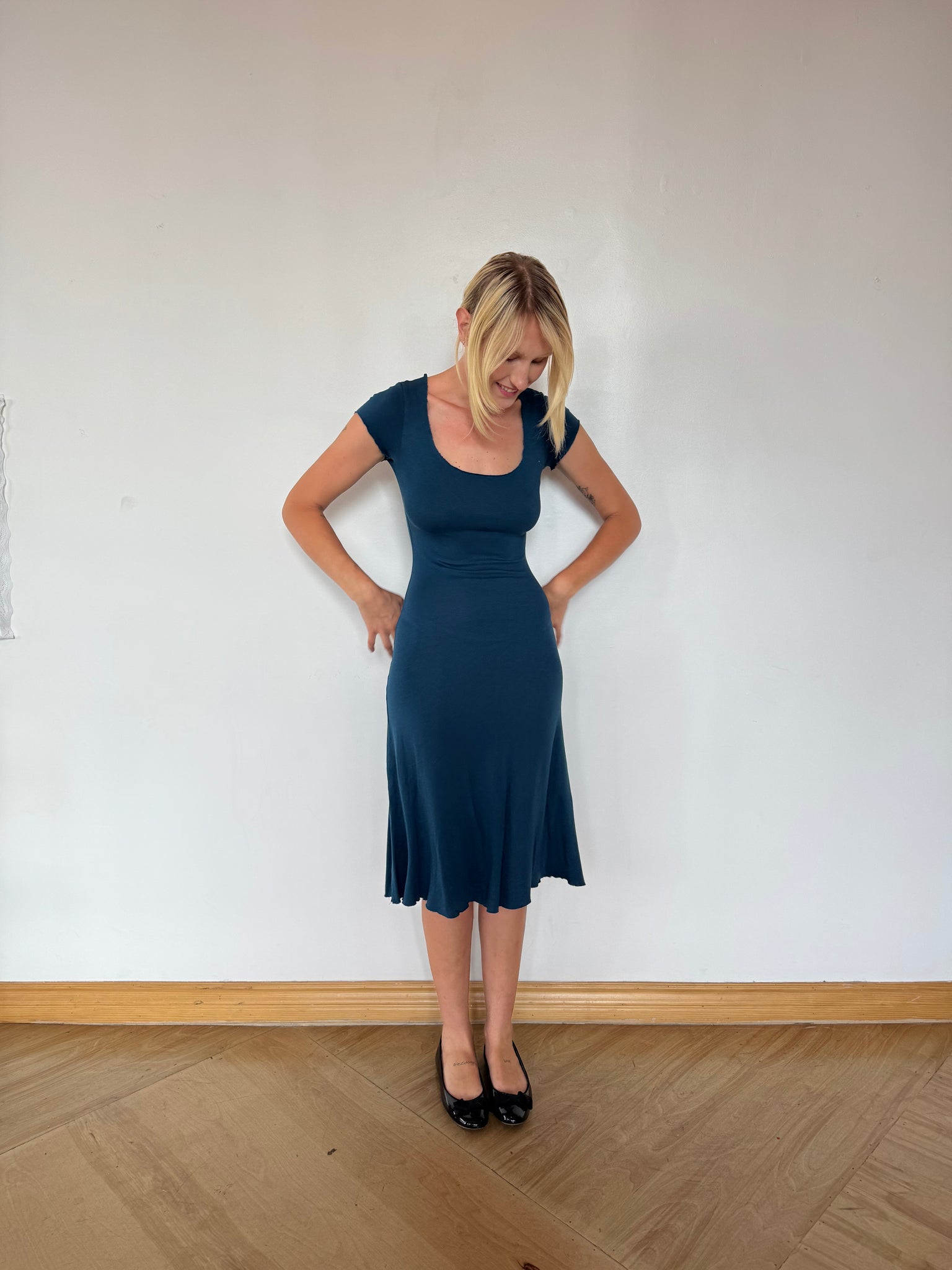 Low Rounded Neckline, Cap Sleeves, Midi Length